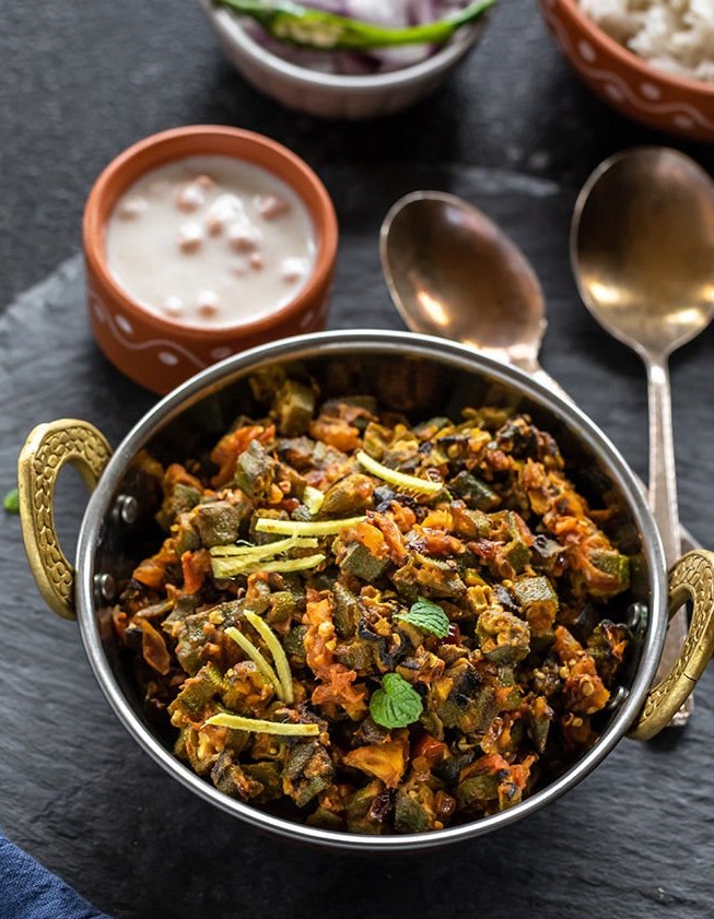 Spiced okra cooked in a ginger sauce with sauteed tomatoes, onions & vegetables